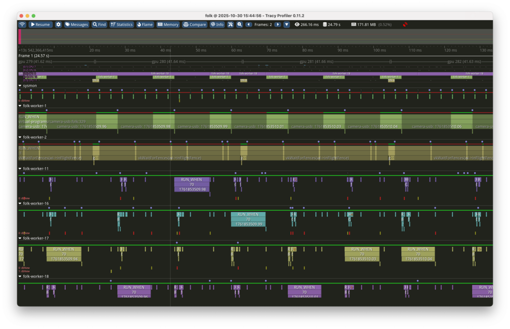 Performance is definitely better than on the old folk0 – not perfect, but it feels like the bottleneck now is motion blur / camera stuff rather than compute. (Makes me want to get a newer/faster computer; both folk0 and folk-hex are basically from like 2018.)