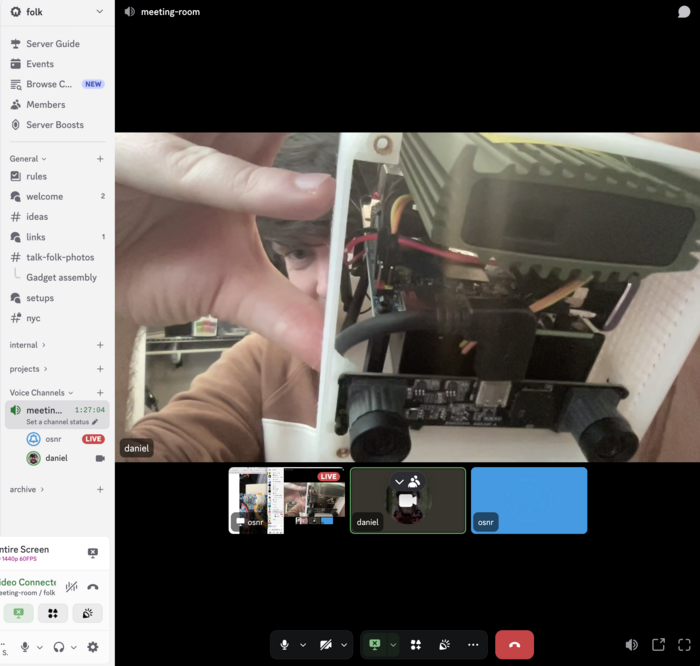 These have just been on the meeting room channel in Discord – would love for other people to watch / join in on the pairing, or also pair with us. (I'm thinking of eventually streaming, too, especially once we're doing more work in the system itself.)