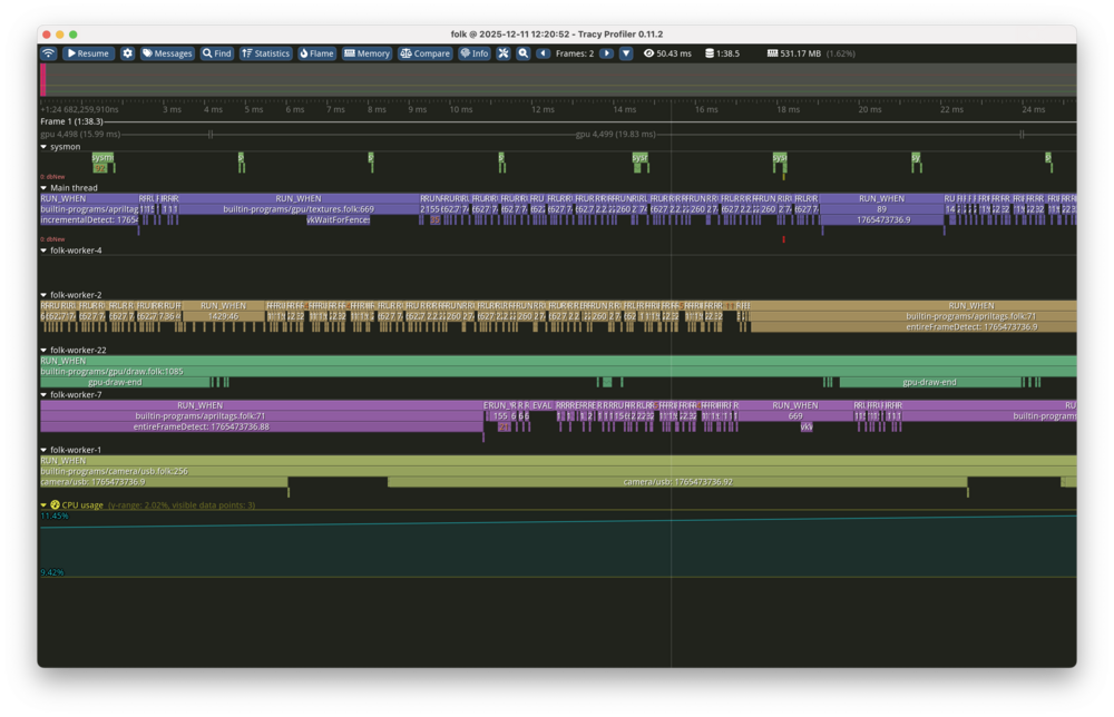 We started on using JPEG frames in the system for /setup / live preview last month. This month, we added decompress and AprilTag detect steps on top, making the normal Folk pipeline work again.