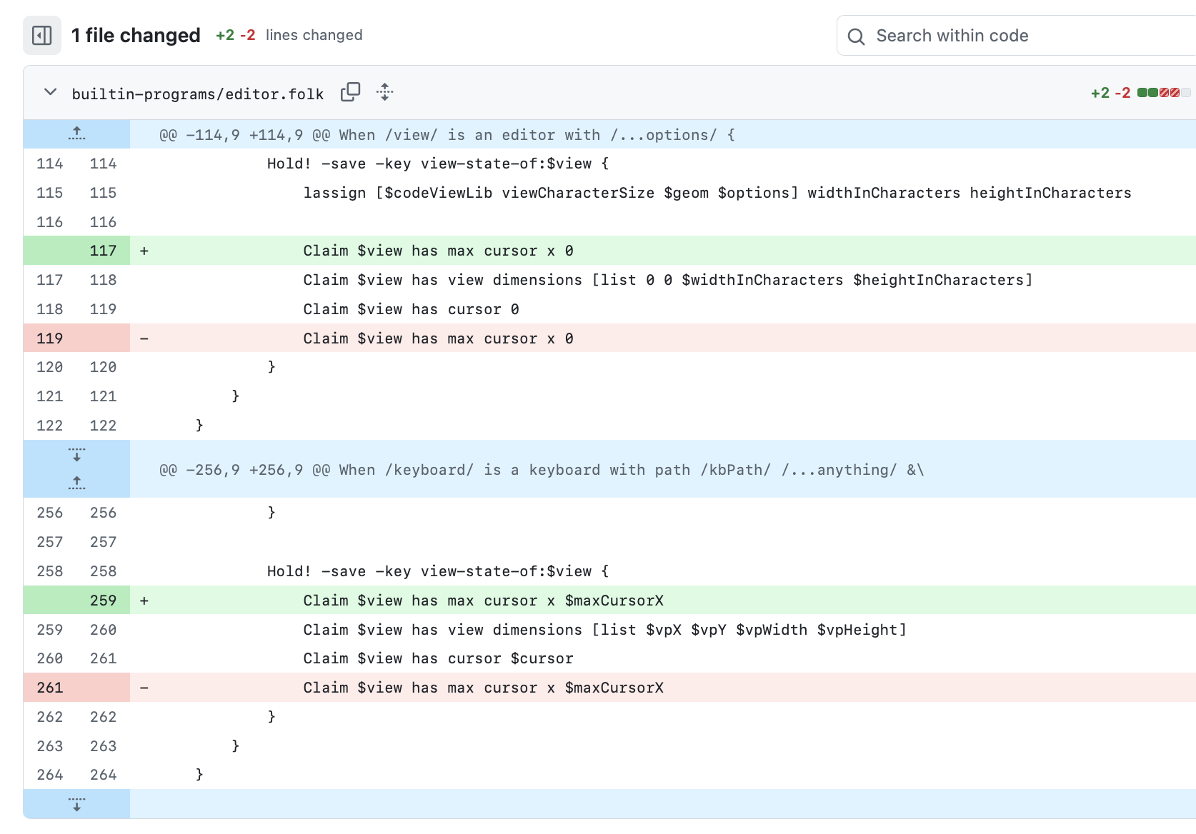 Mason did a big editor refactor that removes traces of the old “code view” terminology, cleans up the state, and makes the line numbers render more cleanly (no more snapping around when you go from 1-digit to 2-digit line numbers + dynamic left margin so the line numbers don't take up a tiny or huge amount of space on extreme zoom). Scroll also works better (retains more context).