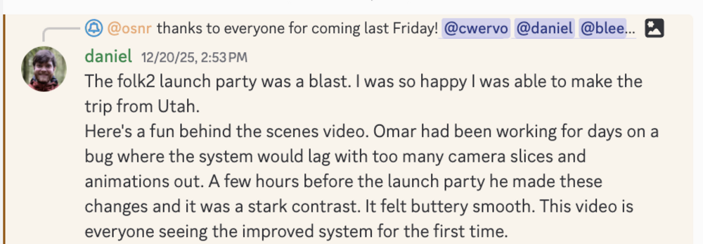 Was a good way to bring people in who hadn't seen Folk in a while, announce nonprofit and folk2 updates, and force ourselves to make progress on public-facing niceties in the Folk system. (We probably made a couple months' worth of progress on little nits in the week before the party.)