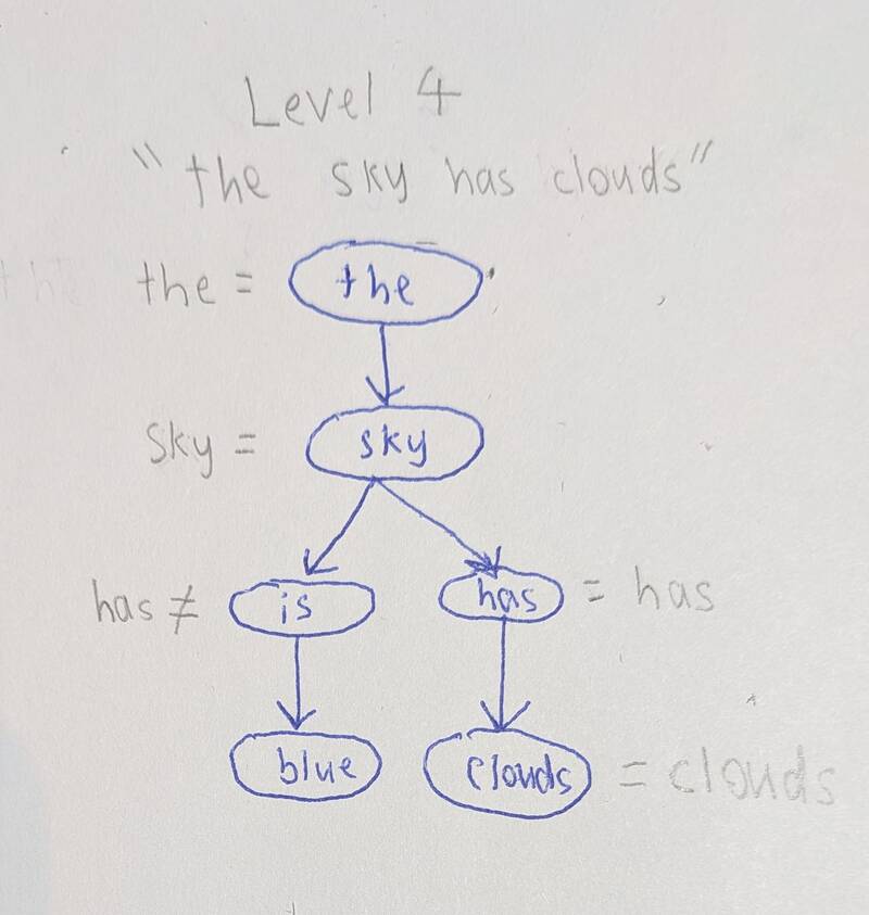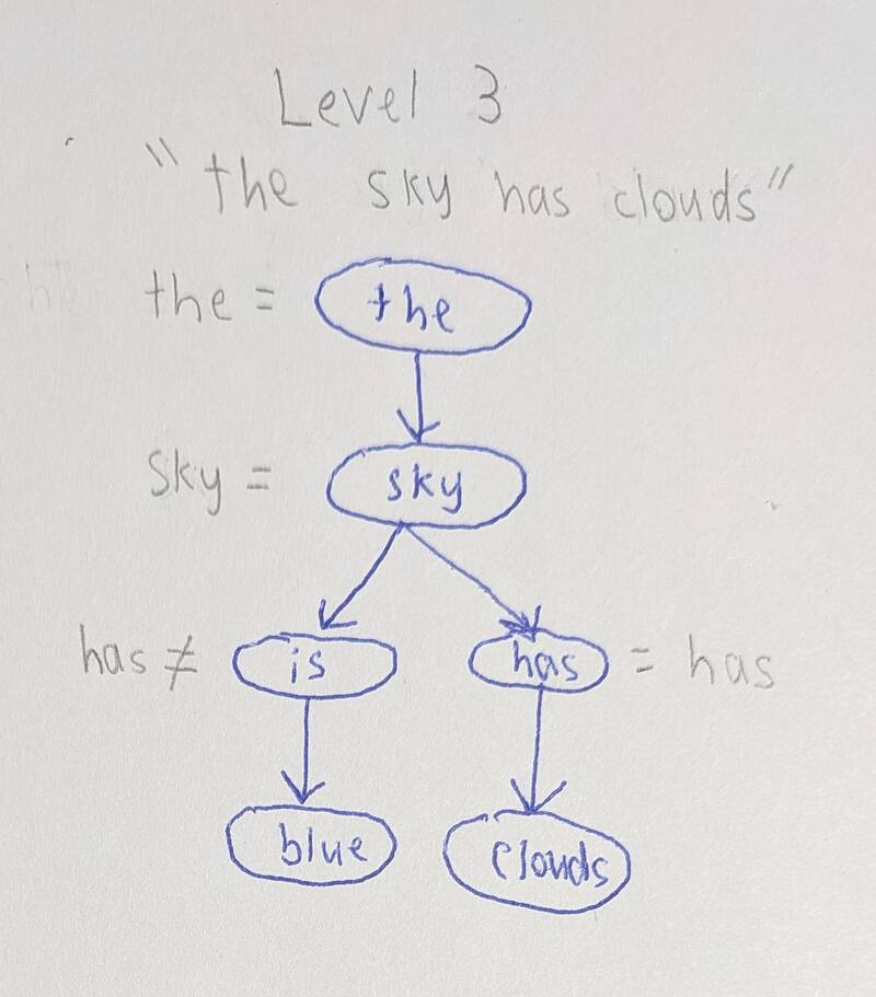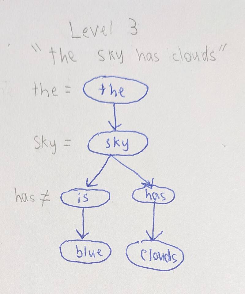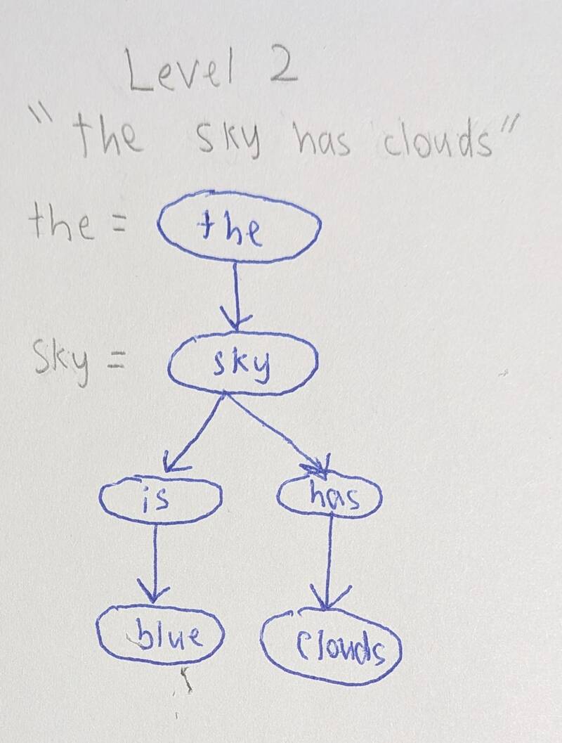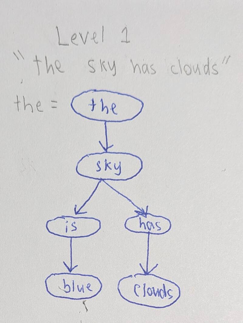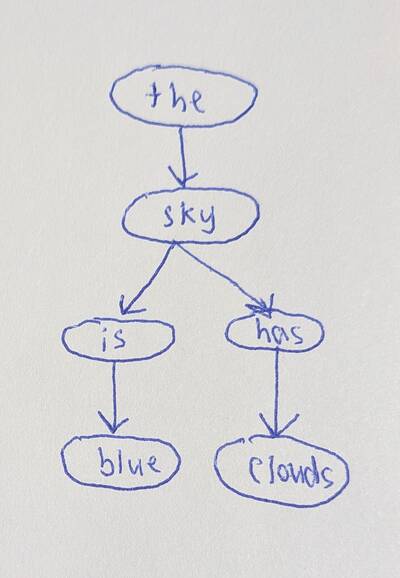As you can see, the Clause has been turned into a set of nodes in the Trie. Let's try inserting another Clause, “the sky has clouds”: